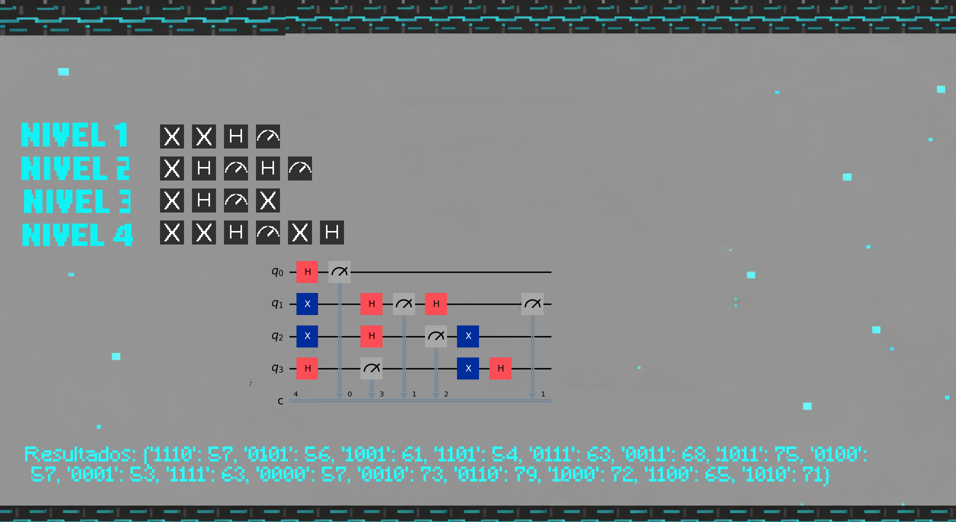 O qubit en estado 0 móvese polo chan, mentres que o qubit en estado 1 móvese polo teito. Moitas veces será necesario utilizar as portas cuánticas e as medidas para avanzar nos niveis, hai que pensar!